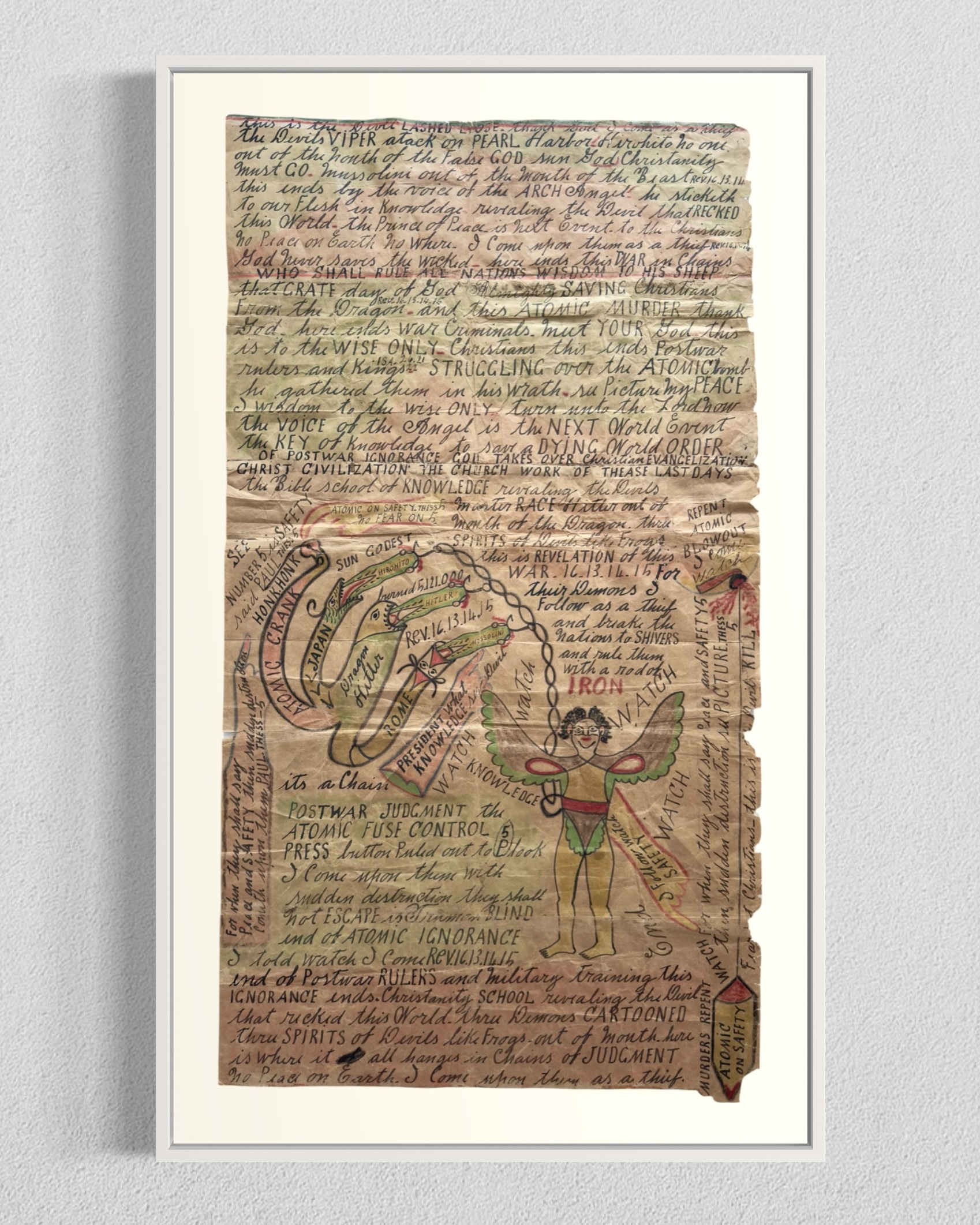 This singular drawing relates to the Outsider Art environments created by Jesse Howard, W. C. Rice, Howard Finster, and Sister Gertrude Morgan.