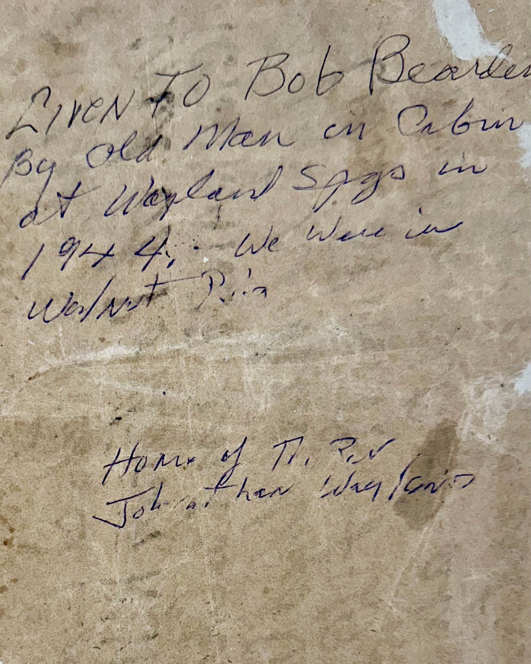 We don't know who created this drawing, but an inscription on the back provides clues about its time and place. It reads, "was given to Bob Bearden, By Old Man in cabin At Wayland Springs," which was a Methodist camp located in Imboden, Lawrence County, Arkansas. "Bob Bearden" was the Reverend Robert Edward Lee Bearden and died in 1949. So, we can date the drawing between 1945 and 1949.