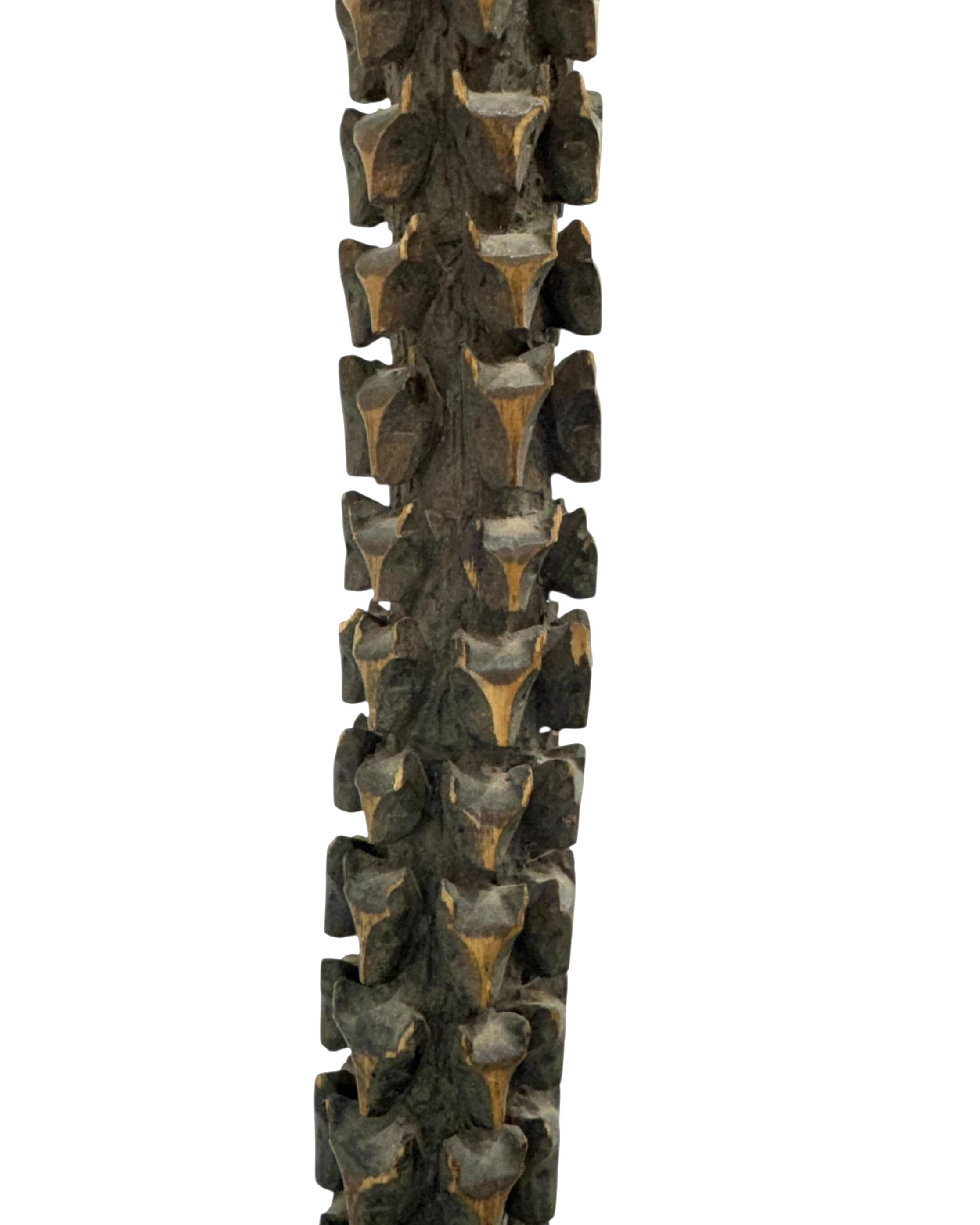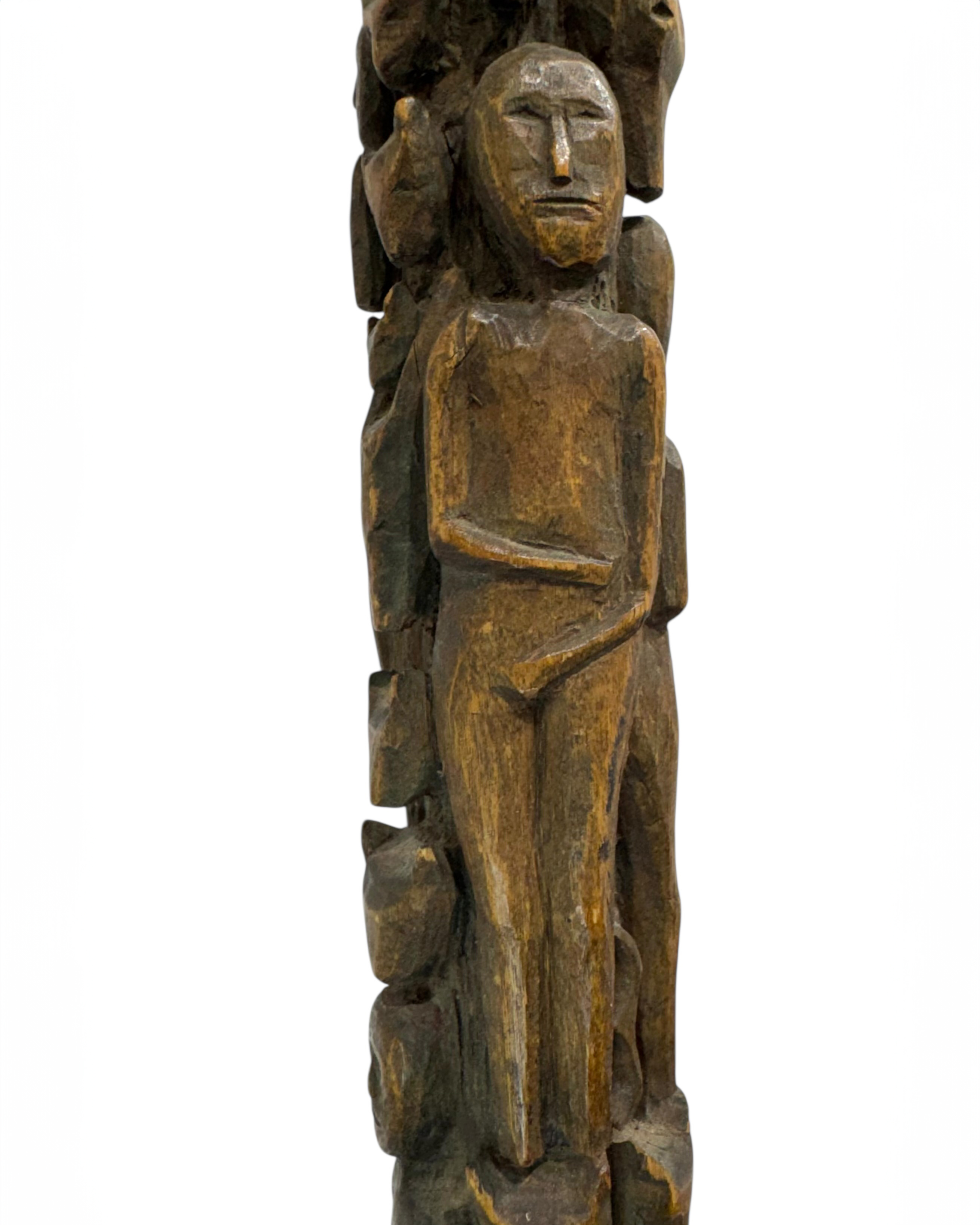 This Lenape or Delaware speaker's staff, featuring figural carvings, is related to Delaware-carved masks and drumsticks. The stick is topped with a carved head, which segues into over 200 carvings carvings of various animals, including dogs, foxes, and felines, interspersed with masks of faces and four full figures. Each figure has its arms and hands in different positions, which is likely symbolic.