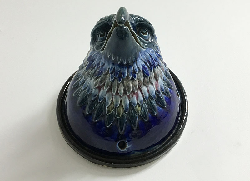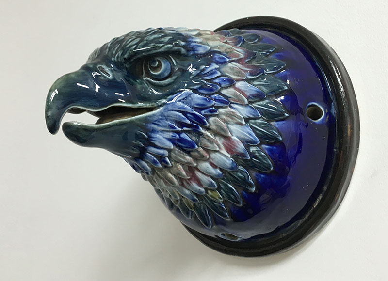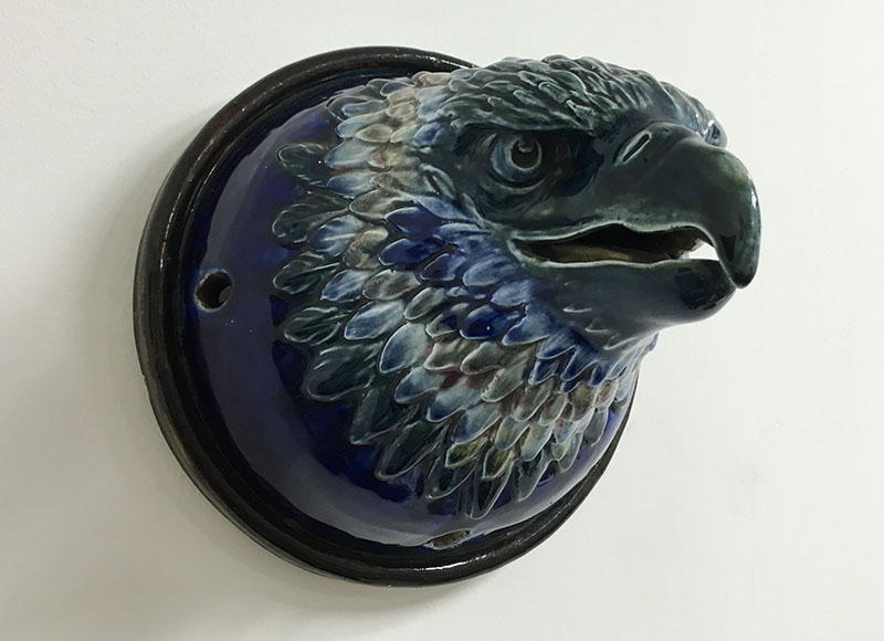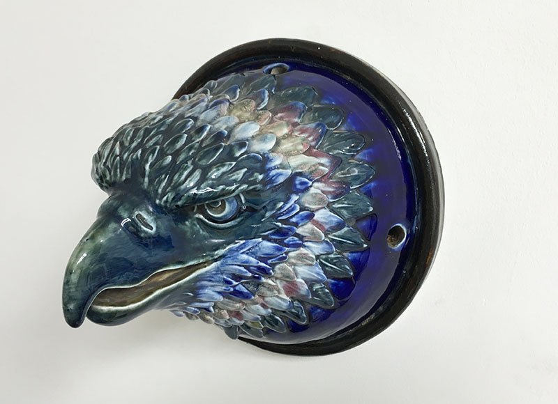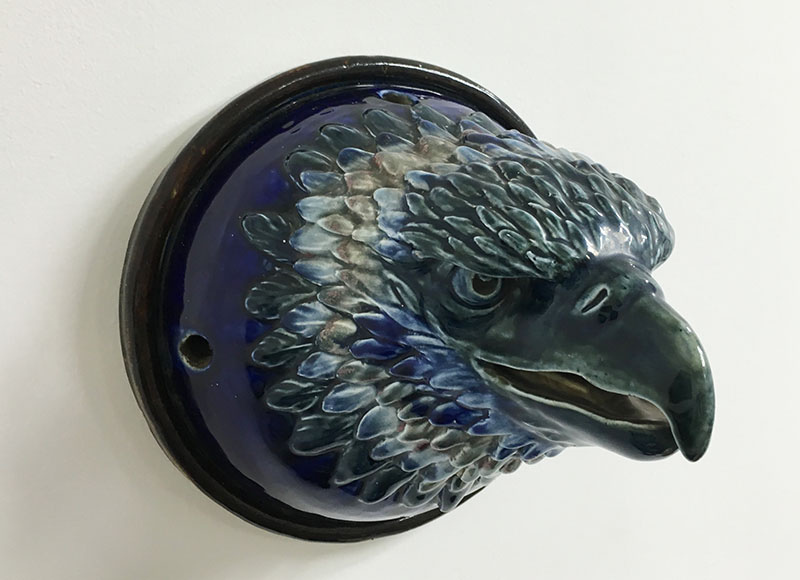 Though its origin and maker is unknown, the artistry is first rate. The feathers are glazed in a deep cobalt blue, white and traces of red (reds are difficult to achieve in ceramics). The beak and eyes are more a bluish-green. Possibly a commissioned work as an architectural element or an exhibition piece.