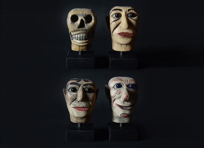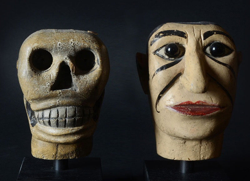 A set of four puppet heads made by the same hand—each constructed the same, but with a different look and personality. Three have glass marbles as eyes, except for the skull (makes sense). The clown head is quite awesome with a fantastic paint surface and brilliant blue marble eyes. The skull has a full grin and has painted sutures along the cranial plates. The other two men feature dark hair and thick eyebrows and well carved ears.