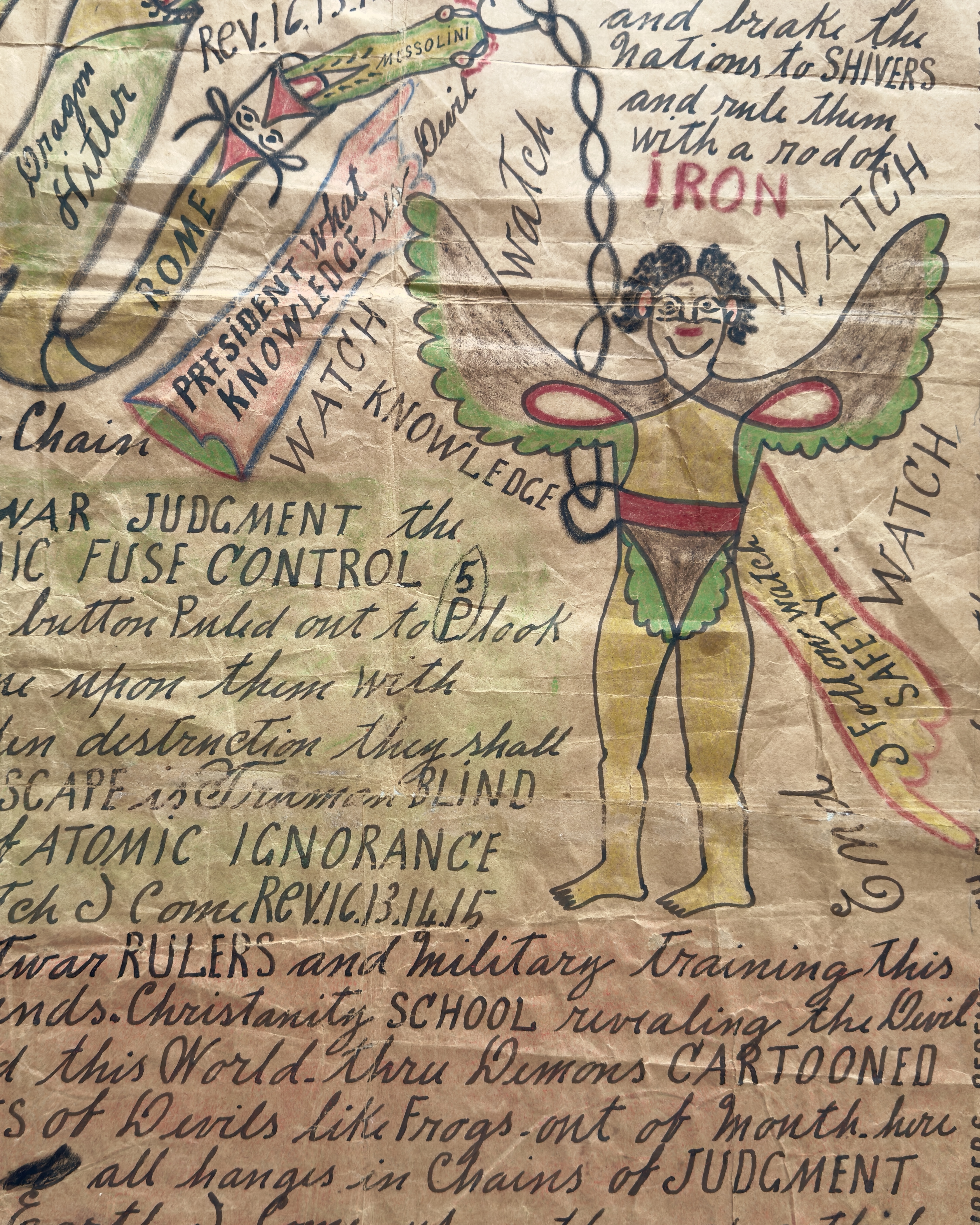 This singular drawing relates to the Outsider Art environments created by Jesse Howard, W. C. Rice, Howard Finster, and Sister Gertrude Morgan.