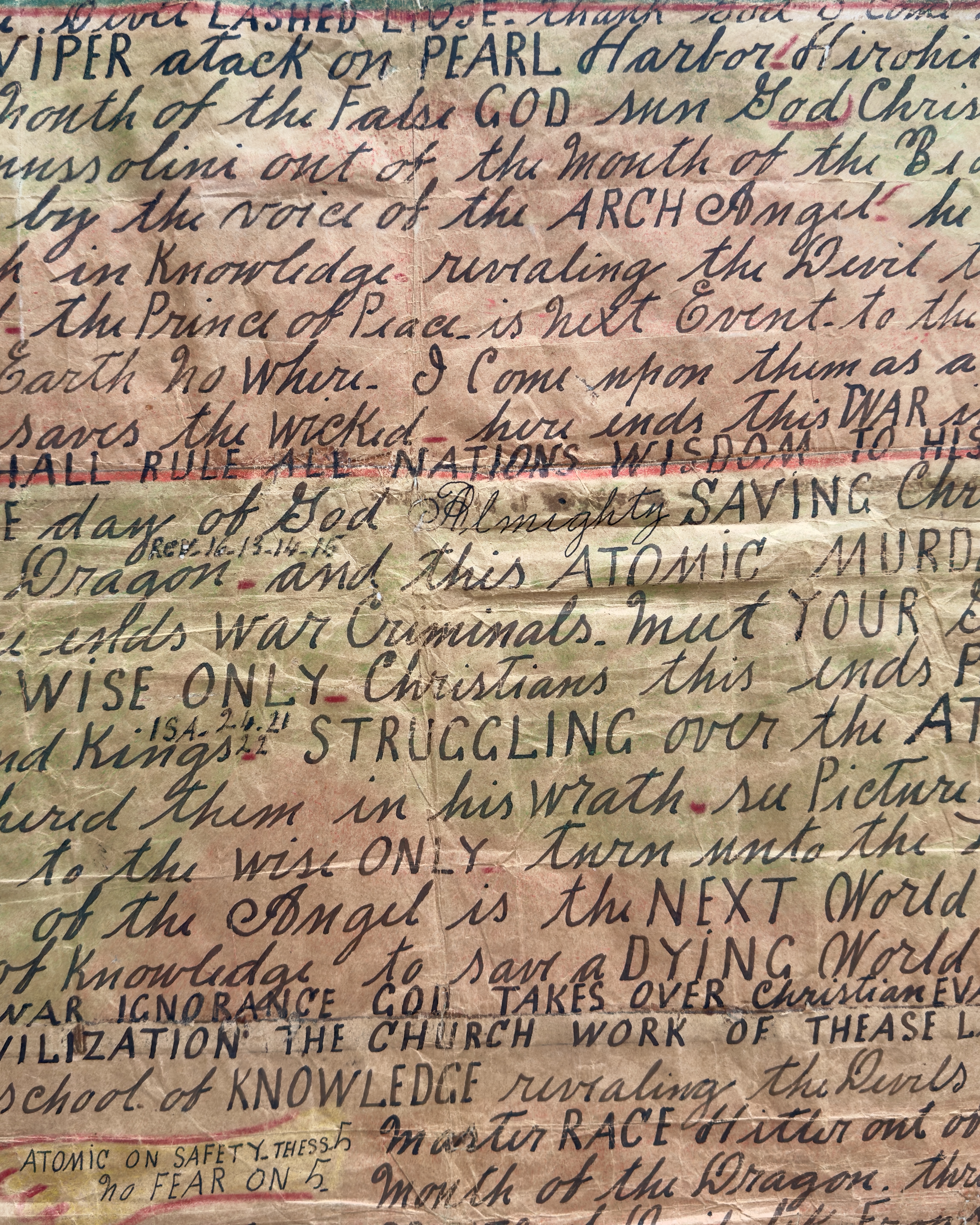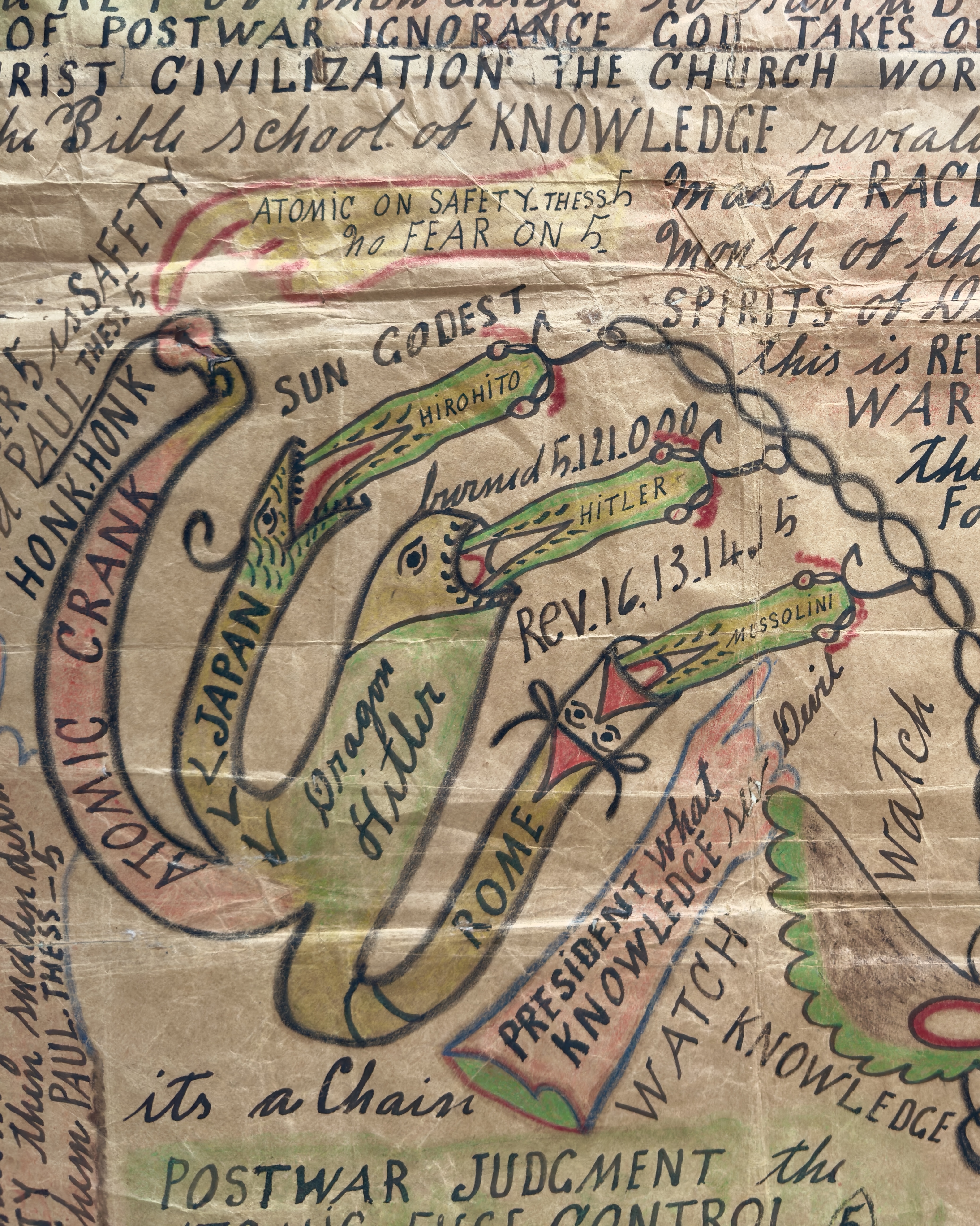 "This is the Devil lashed loose! I come as a thief, The Devil's Viper attack on Pearl Harbor!" So this large crayoned Atomic-Age Adventist Polemic begins.