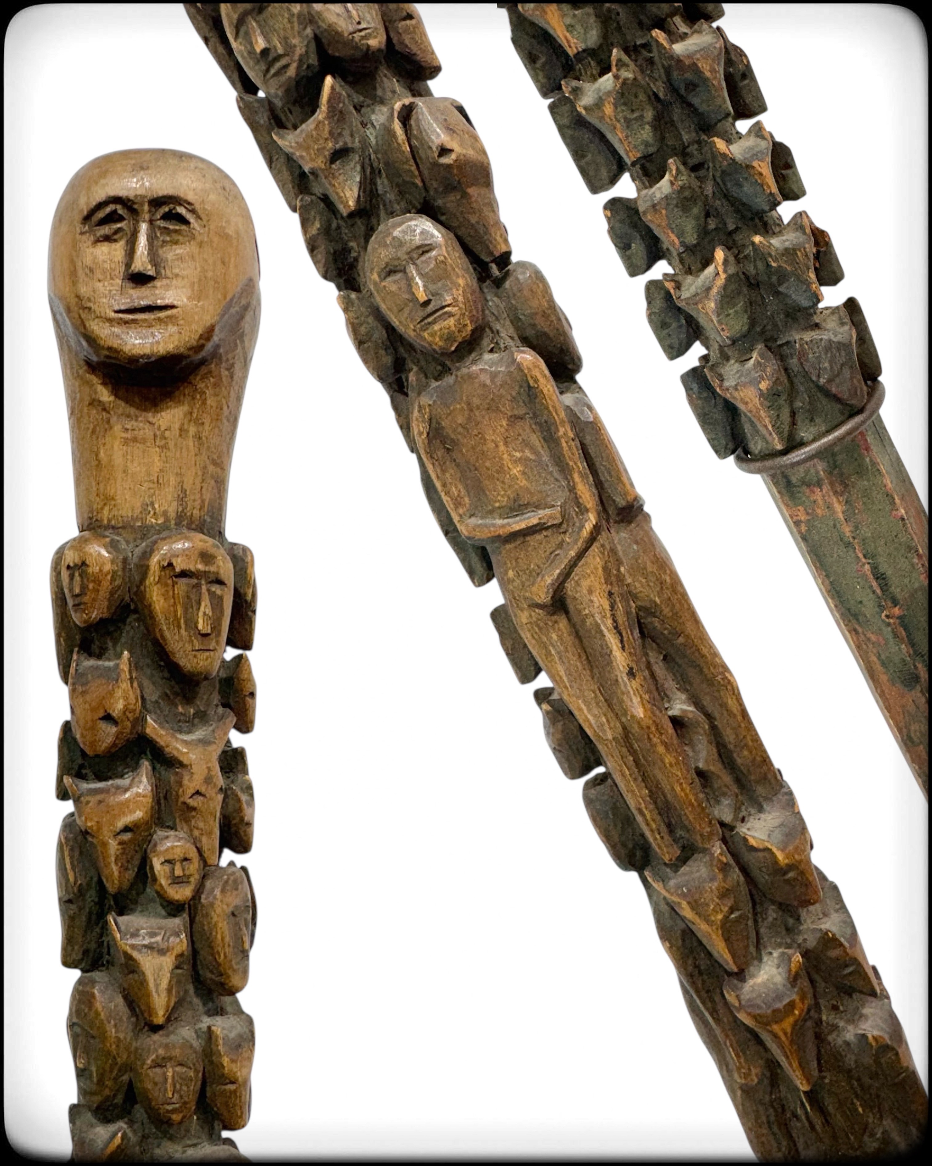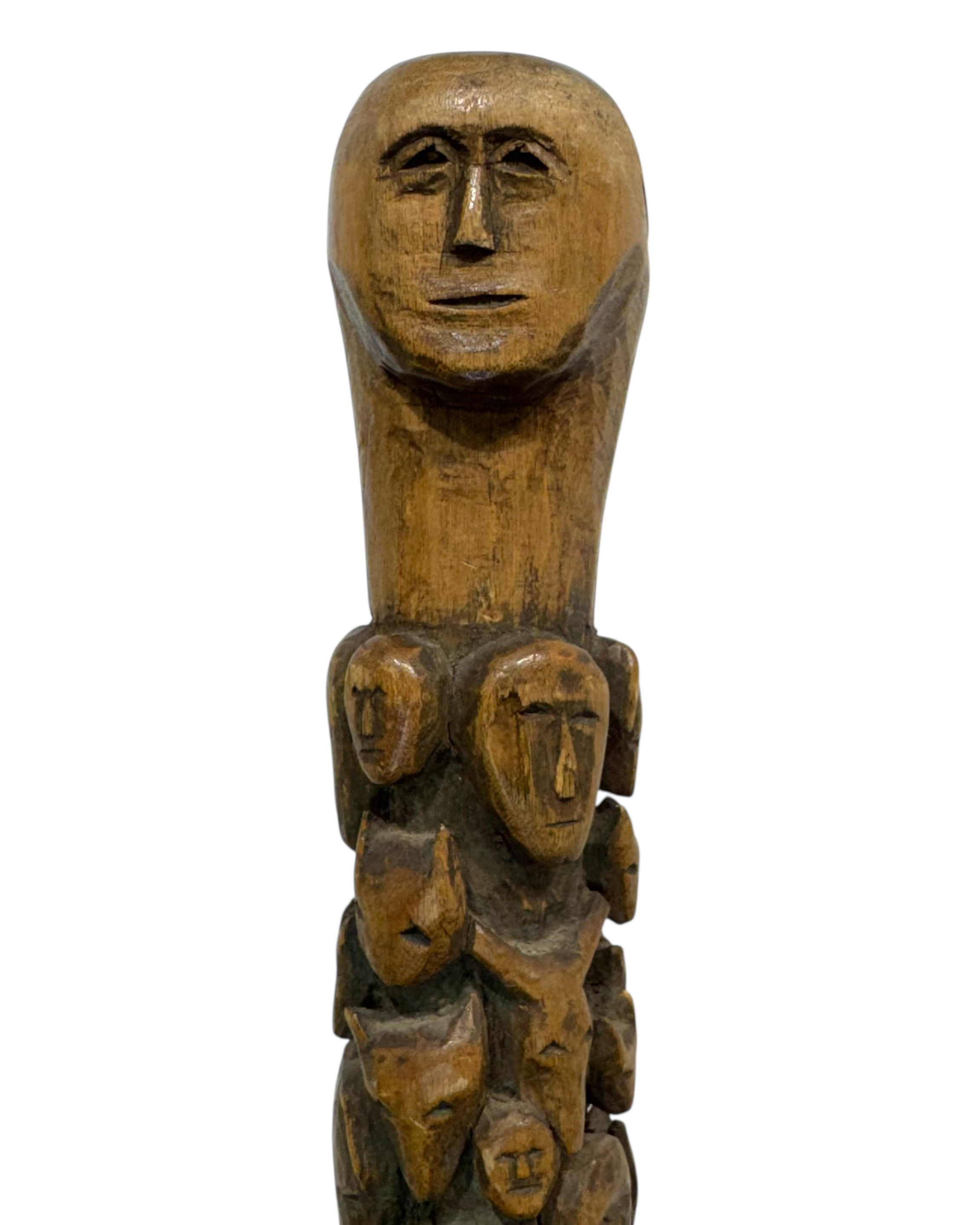 This Lenape or Delaware speaker's staff, featuring figural carvings, is related to Delaware-carved masks and drumsticks. The stick is topped with a carved head, which segues into over 200 carvings carvings of various animals, including dogs, foxes, and felines, interspersed with masks of faces and four full figures. Each figure has its arms and hands in different positions, which is likely symbolic.